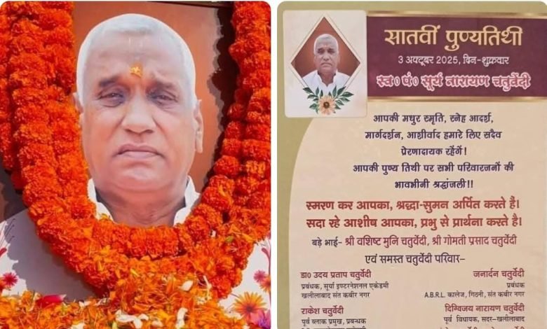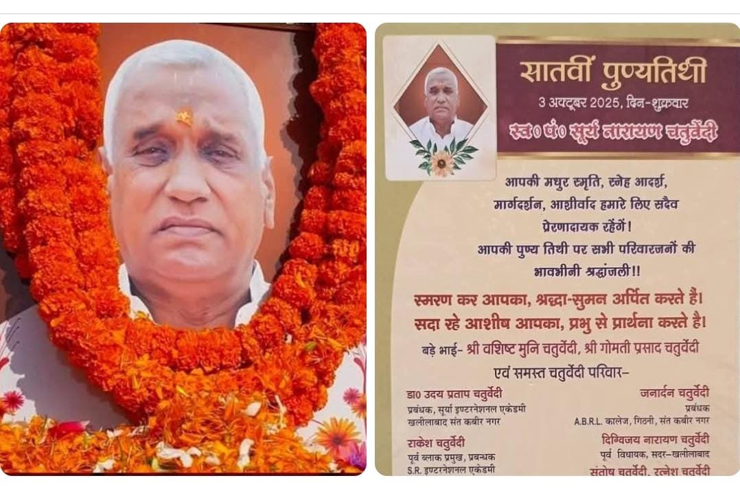 उनके पुत्रो मे पूर्व विधायक खलीलाबाद श्री जय चौबे, सूर्य इंटरनेशनल एकेडी के डायरेक्टर डॉक्टर उदय प्रताप चतुर्वेदी और पूर्व ब्लॉक प्रमुख नाथनगर श्री राकेश चतुर्वेदी ने इस अवसर पर कहा कि , “हमारे पिता हमेशा हमें सच्चाई, मेहनत और इंसानियत का पाठ पढ़ाते थे। उनकी कमी हर पल महसूस होती है, लेकिन उनके द्वारा दिखाया गया मार्ग हमारे लिए हमेशा प्रेरणा रहेगा। पिता का आशीर्वाद हमारे जीवन की सबसे बड़ी शक्ति है।”