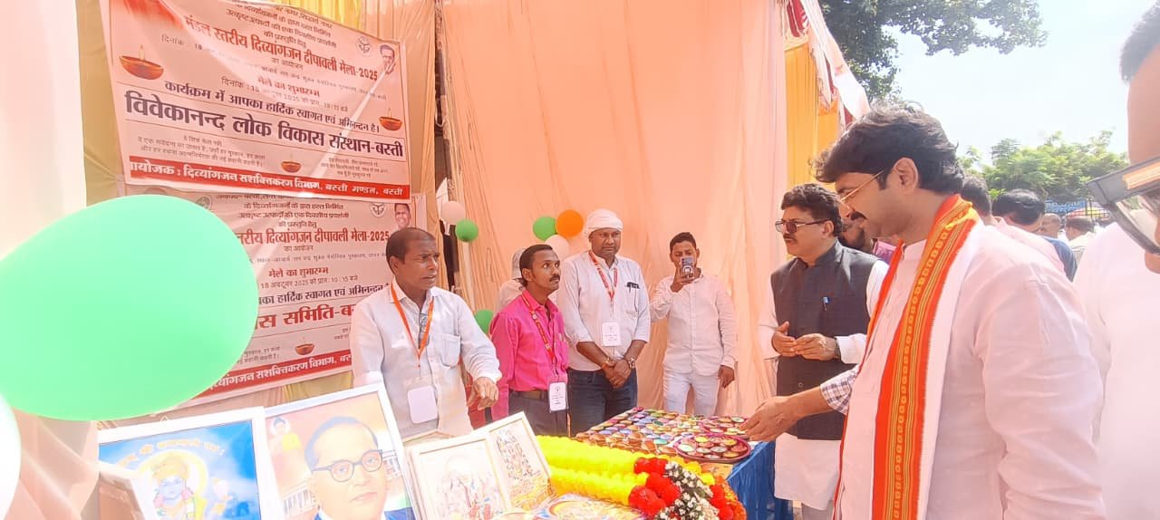 बस्ती: दिव्यांगजन सशक्तिकरण विभाग बस्ती मंडल द्वारा आचार्य राम चन्द्र शुक्ल पुस्तकालय टाउन क्लब में मुख्यमंत्री योगी आदित्यनाथ के निर्देश पर शनिवार को ‘मंडल स्तरीय दिव्य दीपावली मेला-2025’ का आयोजन किया गया। इस दिव्य दीपावली मेले में दिव्यांगजनों के मसले पर काम करने वाली संस्थाओं युवा विकास समिति, विवेकानंद लोक विकास संस्थान, द एबिलिटी नेटवर्क व टेक महिंद्रा फाउन्डेशन के स्टाल प्रमुख आकर्षण का केंद्र रहे। जहाँ मेले में आये लोगों नें दिए में रंग भरने का काम किया वहीँ संस्थाओं के निर्देश में दिव्यांगजनों द्वारा दीपावली पर घरों में सजाने के लिए इनके हाथों बने दीये, मोमबत्ती, अगरबत्ती, वाल हैंगिंग, पेपर के तोरण हों या जूट-पेपर बैग, घी, अचार, किताब स्टैंड, बनारसी साड़ी, अचार-मुरब्बा, पापड़, गाय के गोबर से बना फिनायल, शहद, लिफाफा, फ्लावर पॉड समेत अन्य चीजें इनके हुनर और हौसले को दर्शा रही थीं। यही कारण है रहा कि लोग बरबस ही इस मेले में खिंचे चले आये।